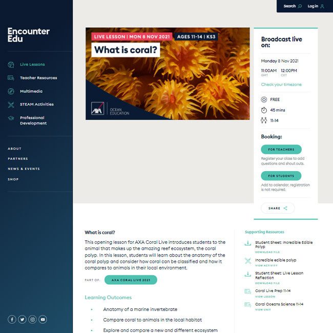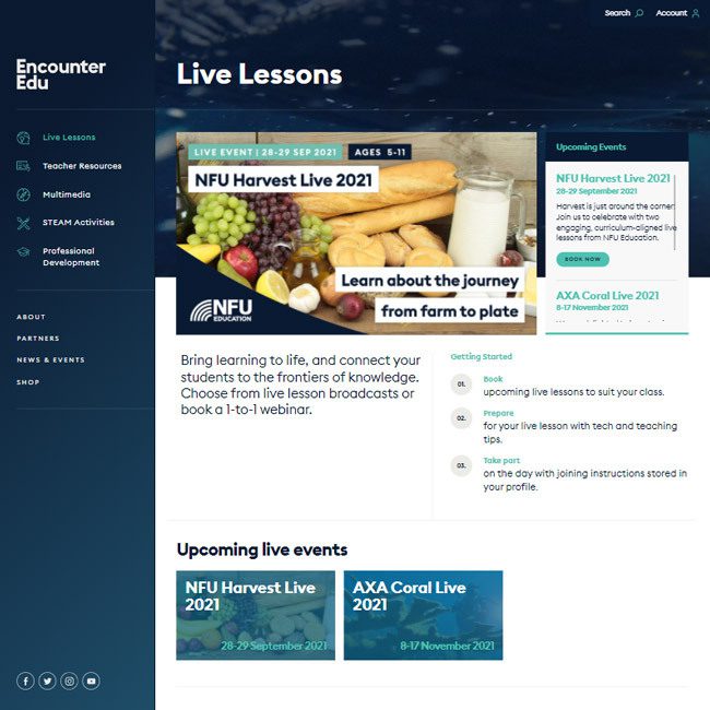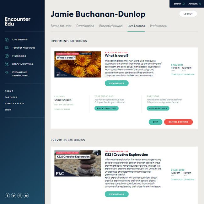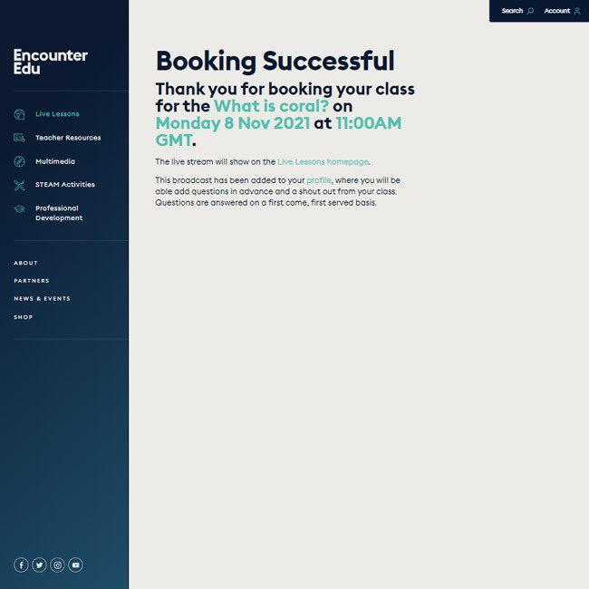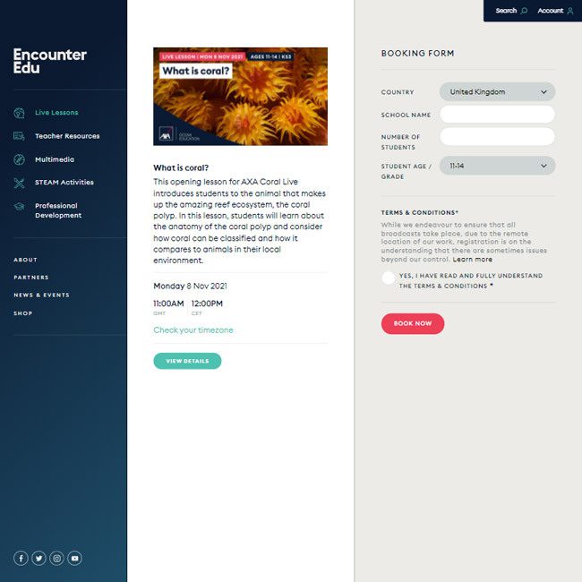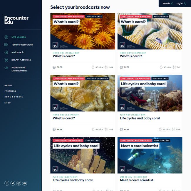 Encounter Edu provides a series of live broadcasts bringing remote environments, live learning and world experts into your classroom. To book any of the live lessons with your class, just follow the steps below.